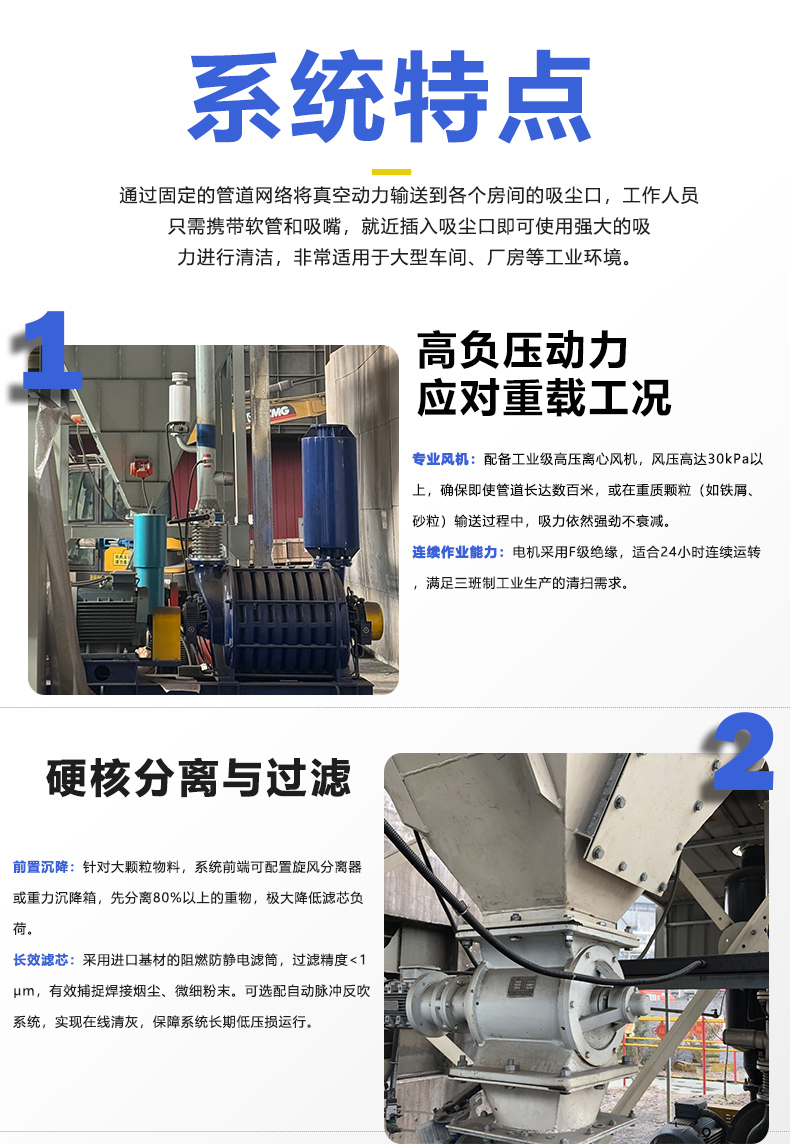 杜绝二次污染:整个收集过程在密闭的负压管道内进行,彻底解决了传统清扫方式(如扫帚、压缩空气吹扫)导致的粉尘二次飞扬问题,极大地改善了车间作业环境。